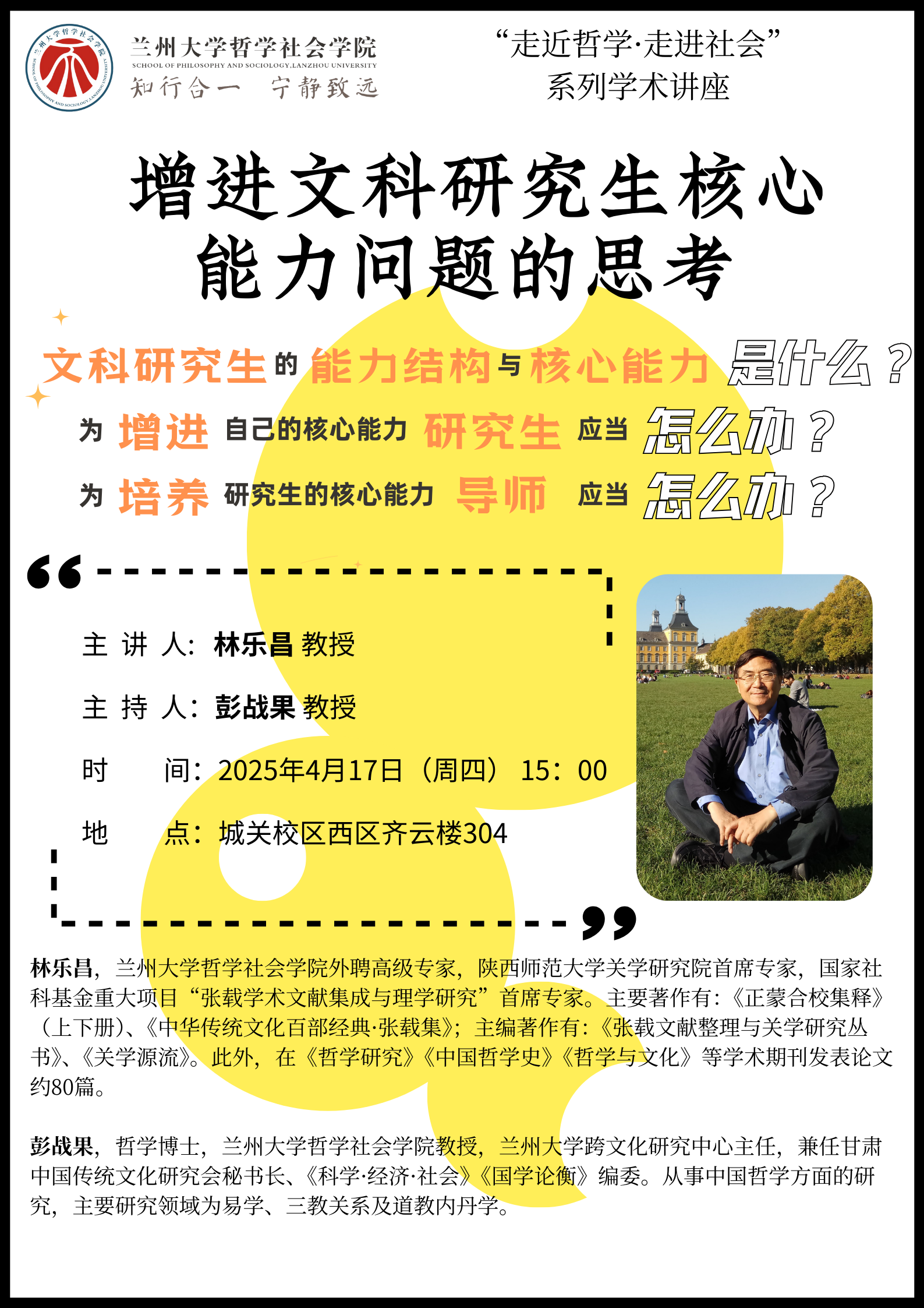 兰州大学哲学社会学院外聘高级专家林乐昌教授将于2025年4月16-17日举办学术讲座,欢迎全校师生积极参加!