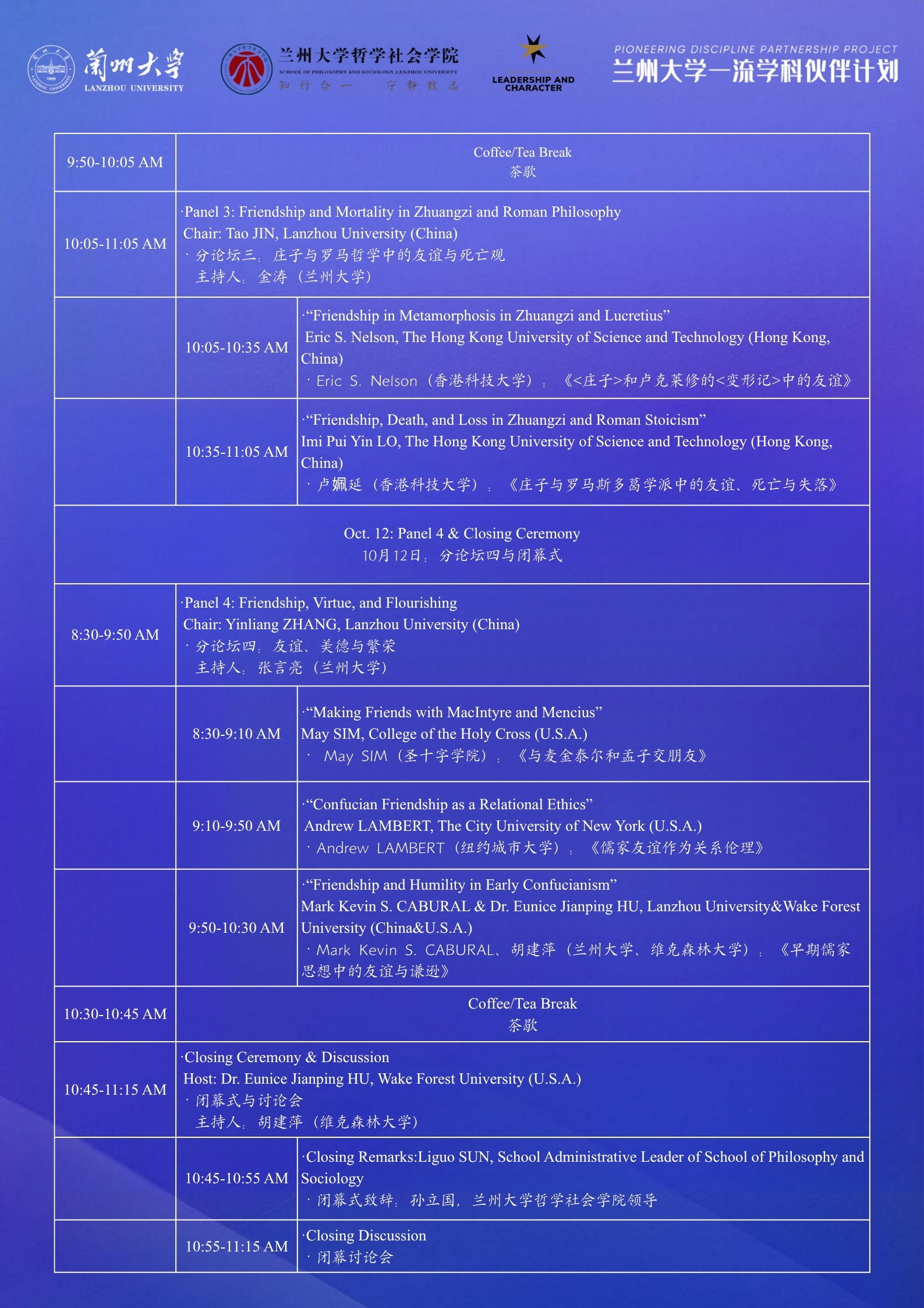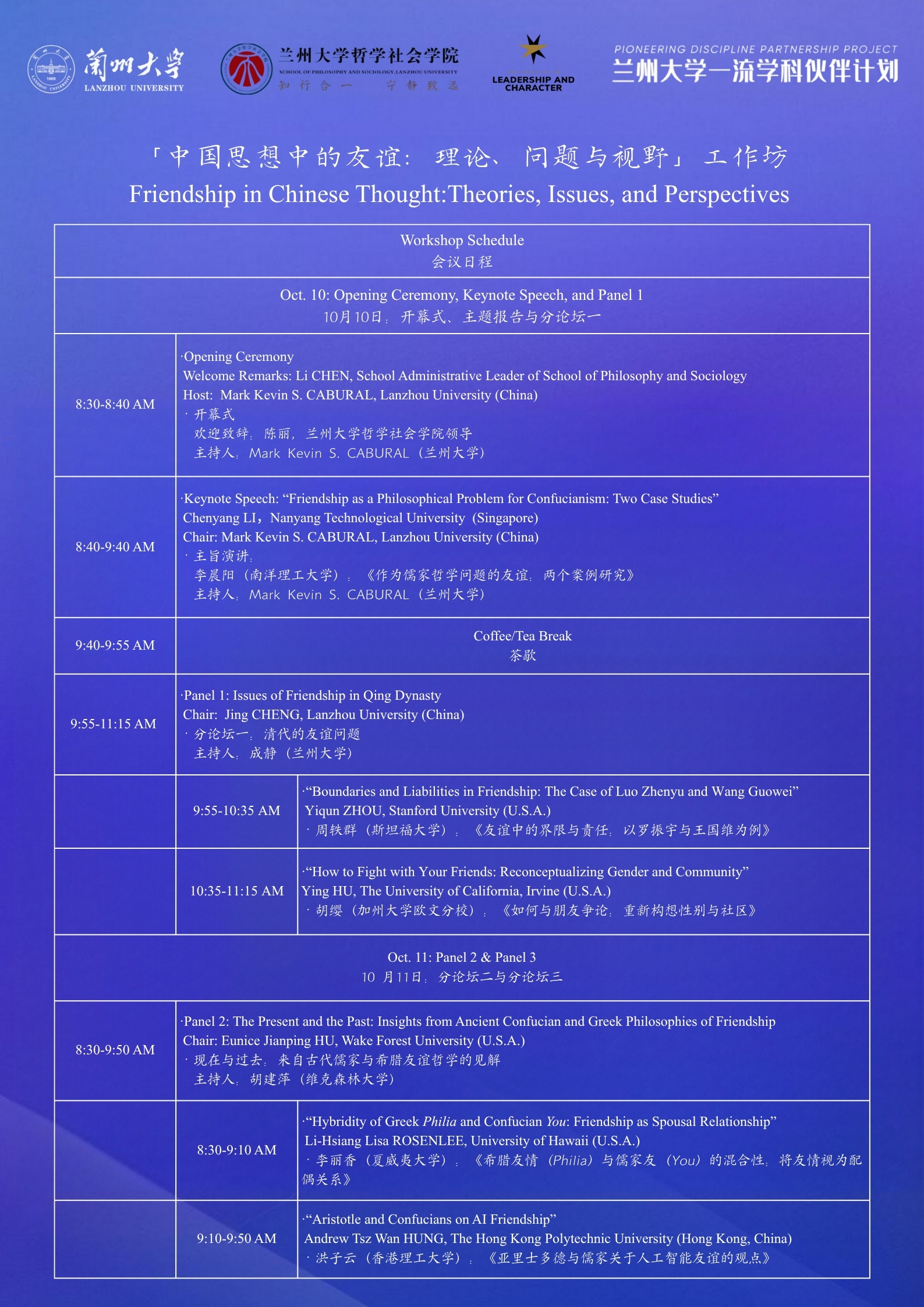 本次“中国思想中的友谊:理论、问题与视野 (Friendship in Chinese Thought: Theories, Issues, and Perspectives)”工作坊得到了 “2025一流学科伙伴计划”(PDPP)的支持,由兰州大学哲学社会学院与维克森林大学领导力与品格项目(Wake Forest University, Program for Leadership and Character)联合主办。我们诚挚邀请各位莅临此次活动。我们相信,这将是一次难得的机会,能促进直接交流、深入对话,并展开富有建设性的友好辩论。