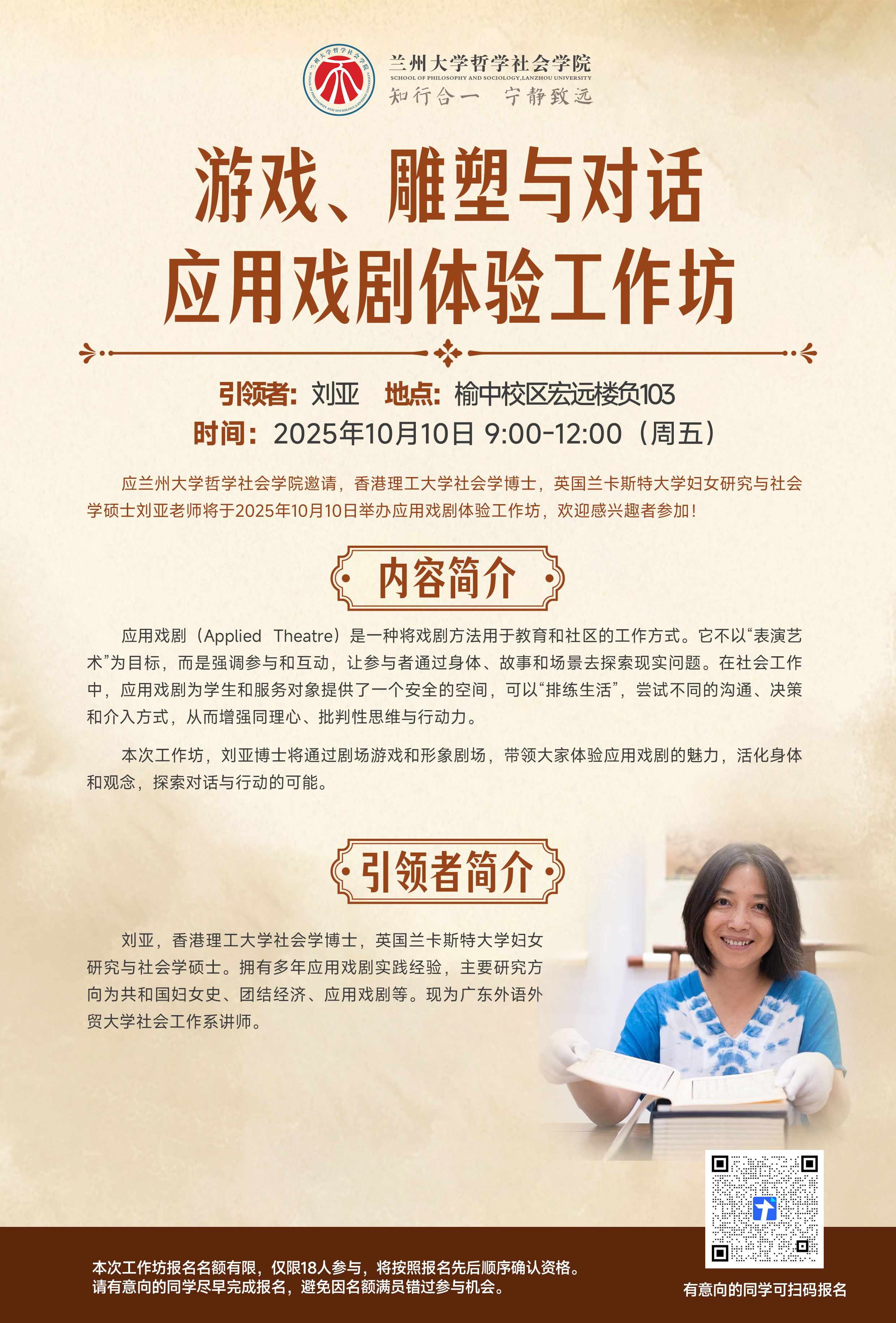 应兰州大学哲学社会学院邀请,香港理工大学社会学博士,英国兰卡斯特大学妇女研究与社会学硕士刘亚老师将于2025年10月10日举办应用戏剧体验工作坊,欢迎感兴趣者参加!