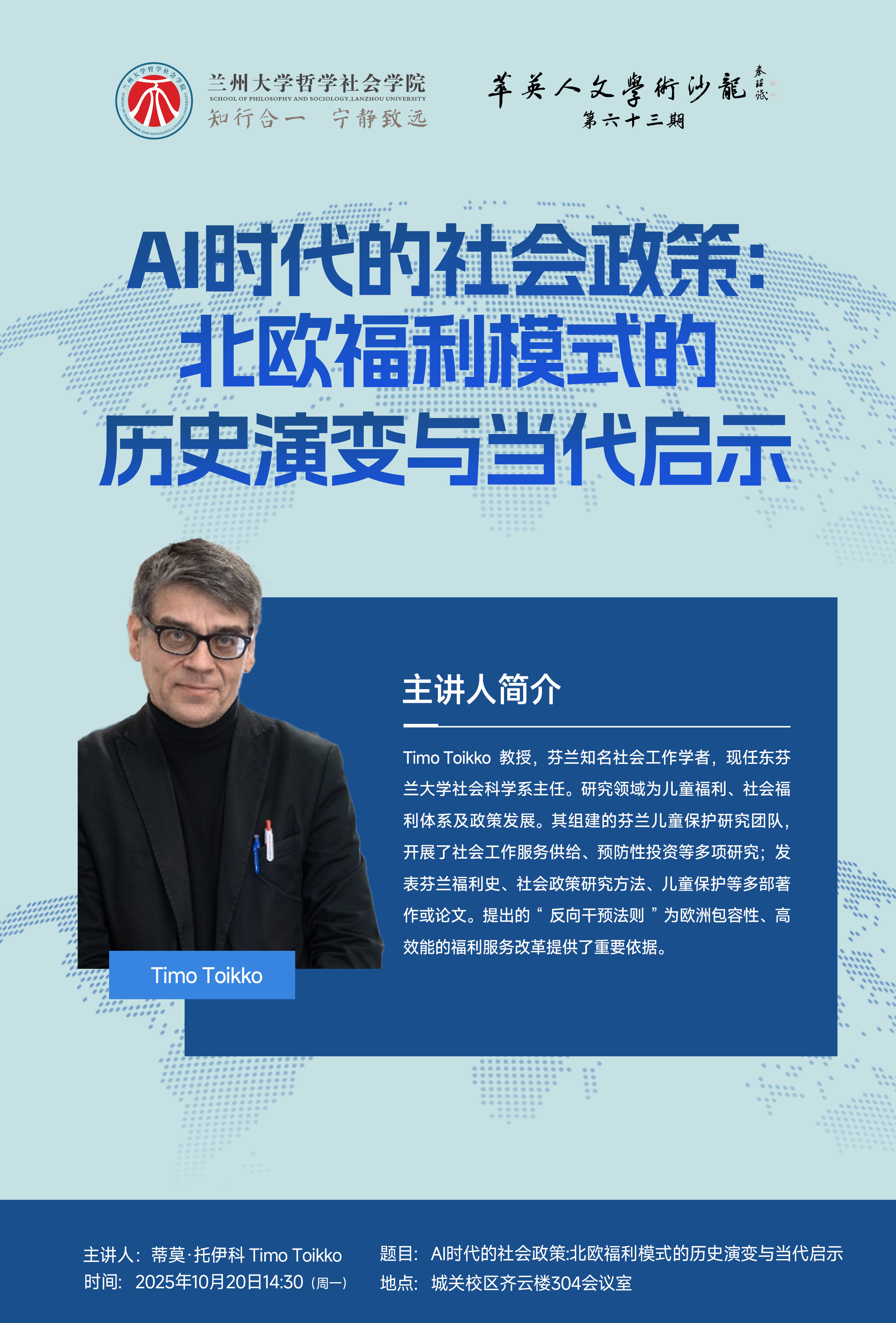 应兰州大学哲学社会学院邀请,东芬兰大学社会科学系主任Timo Toikko 蒂莫·托伊科教授将于2025年10月20日举办讲座:AI时代的社会政策:北欧福利模式的历史演变与当代启示,欢迎感兴趣者参加!