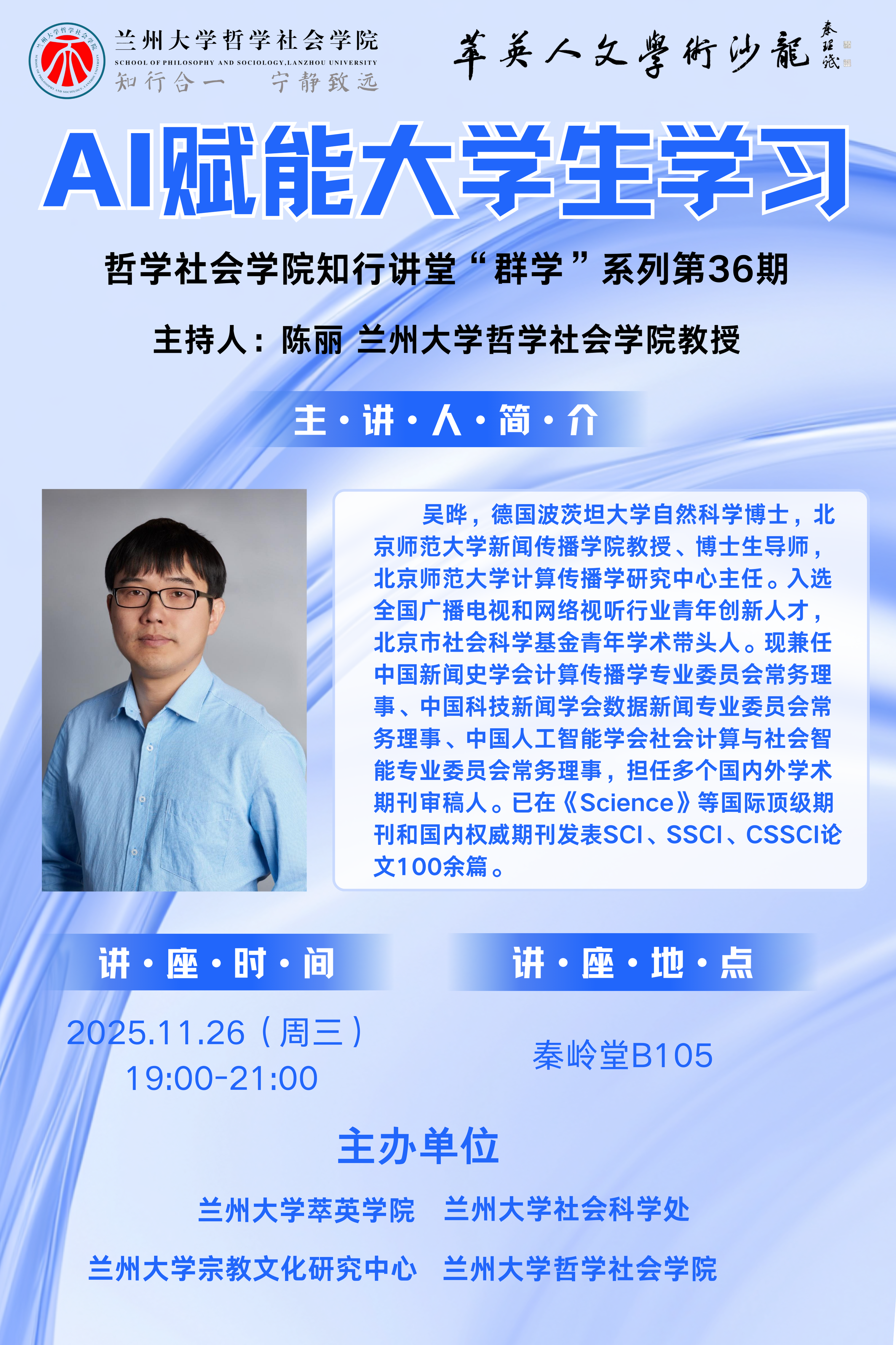 应兰州大学社会科学处、哲学社会学院、萃英学院和兰州大学宗教文化研究中心邀请,北京师范大学新闻传播学院吴晔教授将于2025年11月26日举办专题讲座,欢迎感兴趣的师生参加!