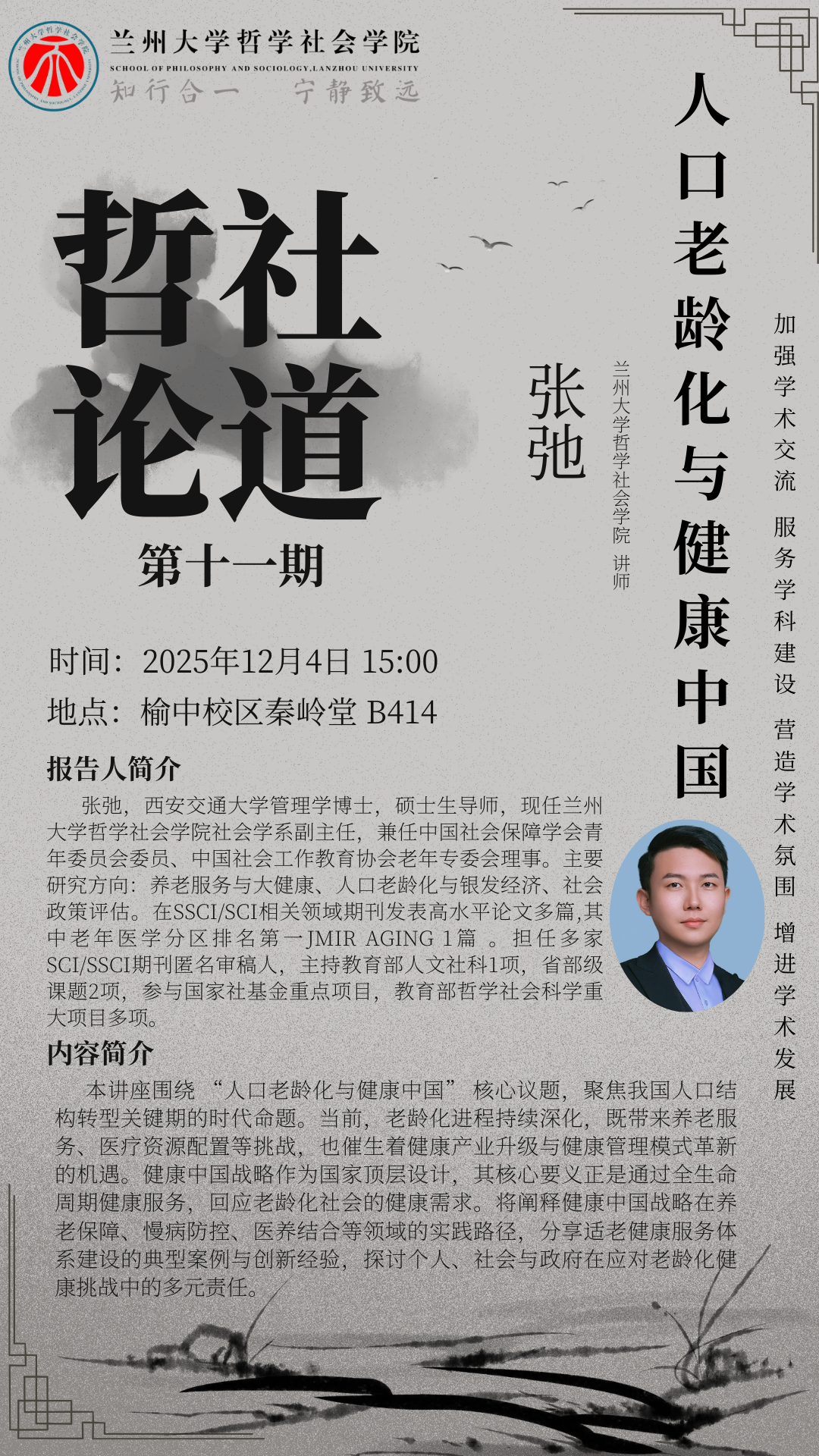 为加强学术交流、服务学科建设、营造学术氛围、增进学术发展,哲学社会学院将邀请张弛老师于2025年12月4日举办专题讲座,欢迎感兴趣的师生参加!
