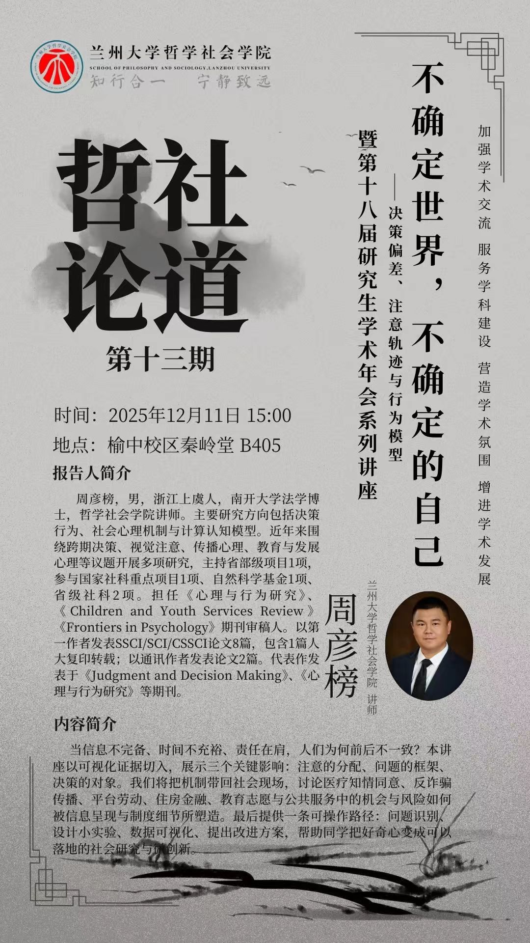 为加强学术交流、服务学科建设、营造学术氛围、增进学术发展,哲学社会学院将邀请周彦榜老师于2025年12月11日举办专题讲座,欢迎感兴趣的师生参加!