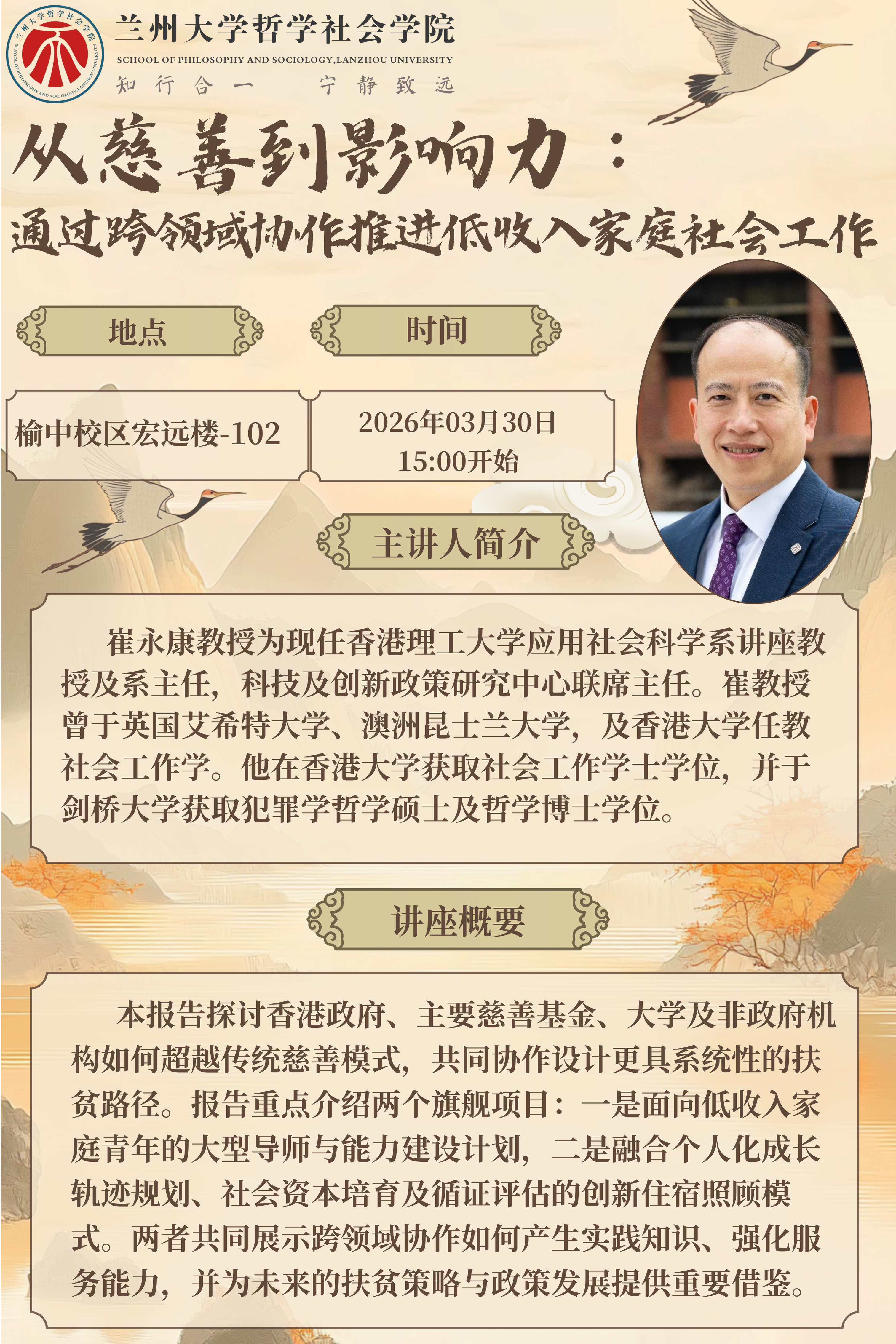 应兰州大学哲学社会学院邀请,香港理工大学应用社会科学系讲座教授及系主任,科技及创新政策研究中心联席主任崔永康教授,将于2026年3月30日举办“从慈善到影响力:通过跨领域协作推进低收入家庭社会工作”讲座欢迎感兴趣者参加!