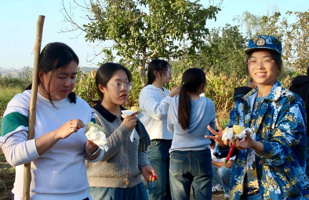 劳动时大家分工协作,有的拿铁锹铲地,有的收集土豆,有的负责分类,忙而不乱,效率极高。后续集体吃煮土豆,虽是简单的食物,但经过挖土豆这么一个劳动后,尽管没有调料,直接食用,却依然感觉好吃,席间满是欢声笑语,途中还抓拍了同学那“巍峨的劳动者形象”。