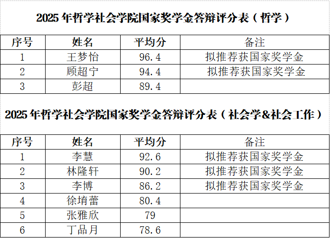 根据《兰州大学研究生奖助管理办法》(校研〔2021〕38号)、《哲学社会学院研究生国家奖学金评定实施细则》等有关规定,经本人申请,学院审核并组织国家奖学金答辩,现就学院2025年硕士研究生国家奖学金答辩成绩进行公示。