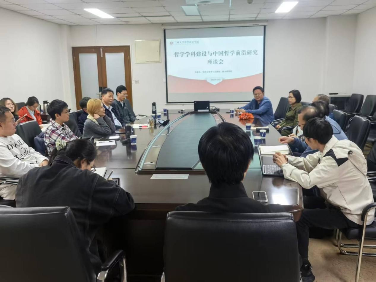 10月10日,中山大学人文学部主任、哲学系陈少明教授,中山大学哲学系李兰芬教授于城关校区开展哲学学科建设与中国哲学前沿研究座谈会。甘肃省人大常委会原副主任、西北师范大学原党委书记陈克恭,学院副院长陈丽教授、哲学系系主任彭战果教授、王涵青教授、钟治国教授、李庭绵教授、张美宏教授、李可心副教授、西北师范大学陈博副教授等二十余位参与座谈会。座谈会由彭战果主持。