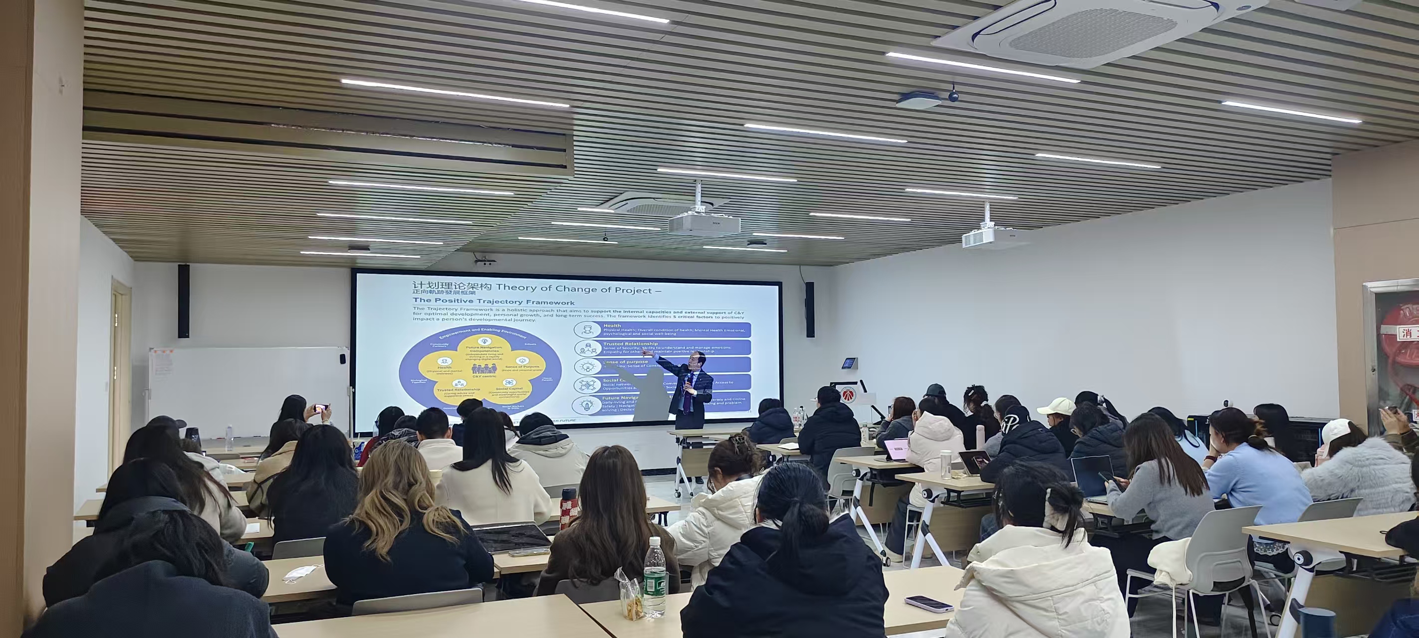 随后,崔永康详细介绍了“共创明Teen计划”和“慈善基金会凝伙计划”两个实践案例。“共创明Teen计划”面向香港弱势社群家庭中就读中一至中四的学生,每期时长一年,通过师友配对、个人发展规划、财政支援等方式开展服务。项目末期,团队基于抗逆力、自信心、责任感、同理心等八项核心指标进行前后测分析,结果显示学员各项能力均有明显提升。崔永康循序渐进地讲解了项目的介入对象、实施计划、理论实践、成效研究及结果分析,生动的实践图片和详细的图表展现了项目成果,深深吸引了在场师生。“慈善基金会凝伙计划”同样亮点突出,展现了高校、政府、企业跨领域协作推动儿童发展的强大影响力。崔永康以香港儿童之家为例,表达了未来希望推动该类项目实现本地实践与国际化结合、进一步拓展服务成果的愿景。讲座内容扎实,讲解掷地有声。现场师生与崔永康深入探讨,提出当前学生群体迫切需要此类项目的支持,期待未来推动相关项目的推广与合作。